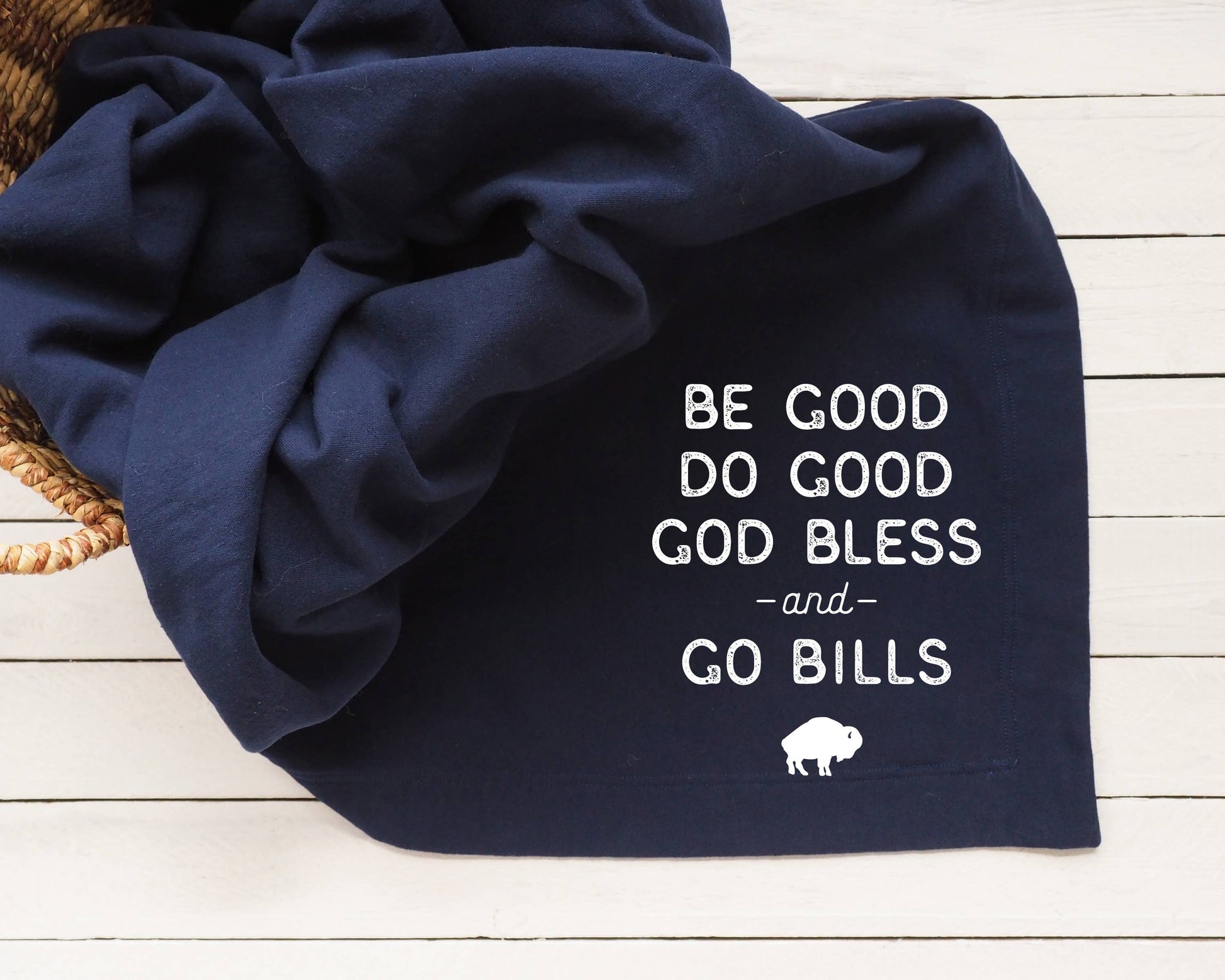 Buffalo Bills Throw Blanket Be Good Go Bills Stadium Blanket Made from super comfy sweatshirt material, it is the best way to snuggle up! Product details: Machine washable. 50% cotton, 50% polyester. Double-needle hem. Mitered V corners. Hemmed sides all around. Dimensions: 60" x 50". Print in White on bottom right hand corner approximately 8" x 10". Printed using our screen print transfer printing method, and will not peel like vinyl.