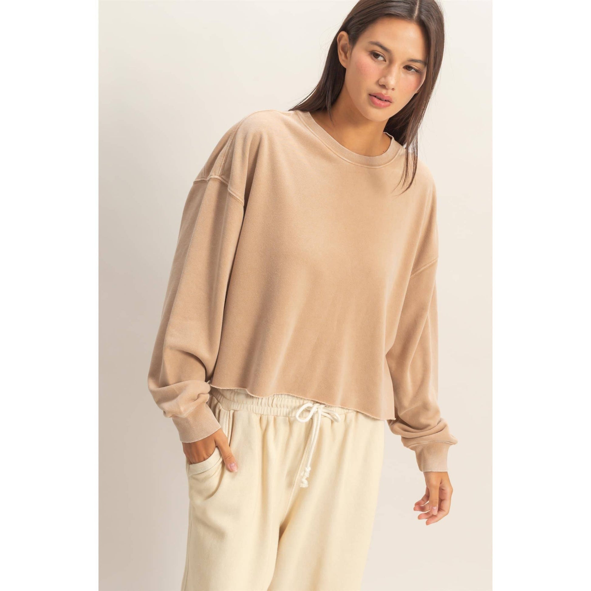 This pullover offers vintage appeal with mineral-washed featuring a classic crew neckline, a back yoke, and roomy dropped shoulders with full long sleeves and ribbed cuffs. Cut in a cropped boxy fit finished with a raw edge hemline, this piece pairs well with high-waisted jeans and sneakers. Self: 80% Cotton 20% Polyester Contrast: 95% Cotton 5% Spandex Model Is 5' 7" Tall, 32" Chest, 23" Waist, 34" Hips And Wearing A Size Small Imported. Designed In The USA