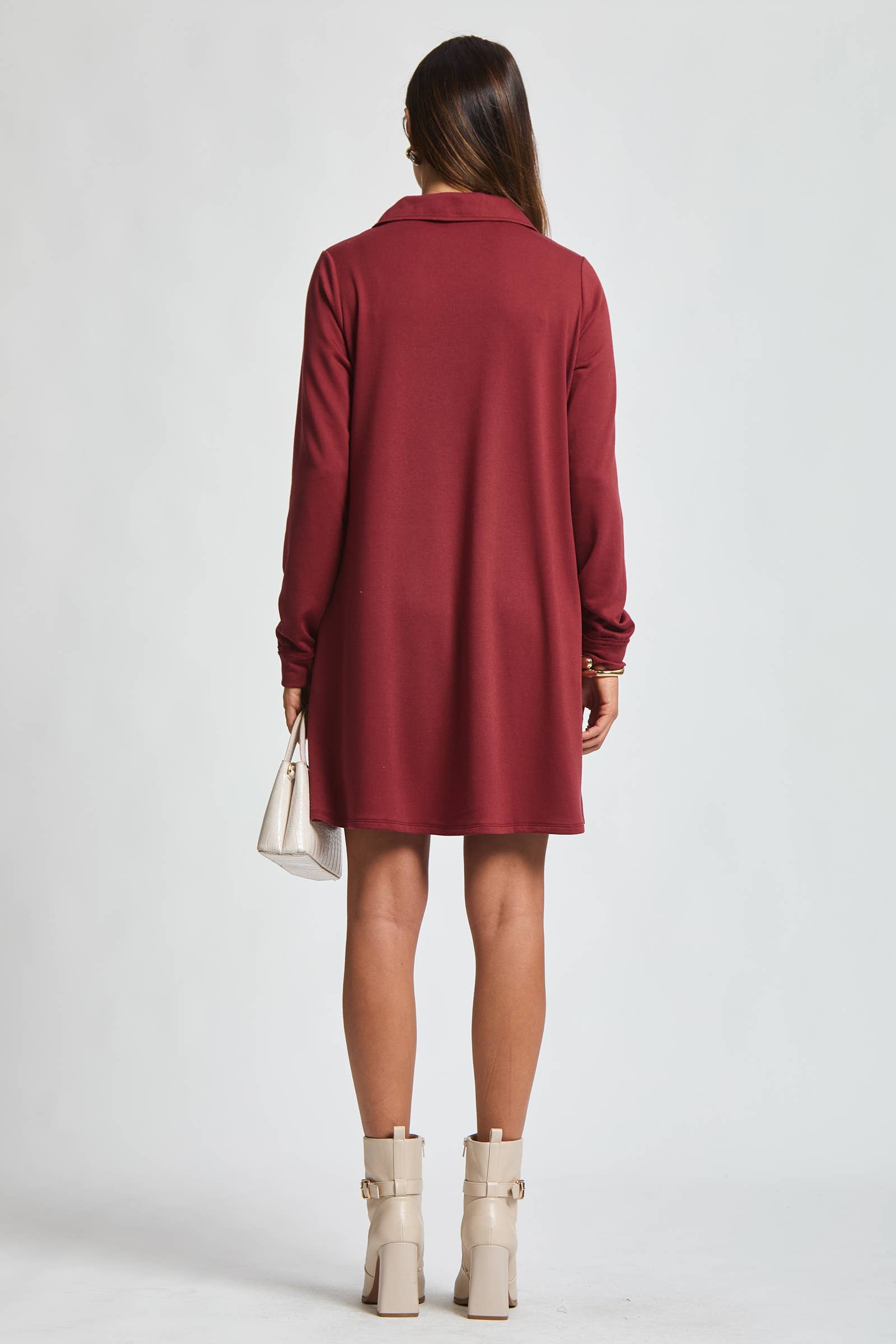 French terry dress that's travel friendly with collar detail and banded sleeves. We love the easy A line silhouette. Knit, stretchy.