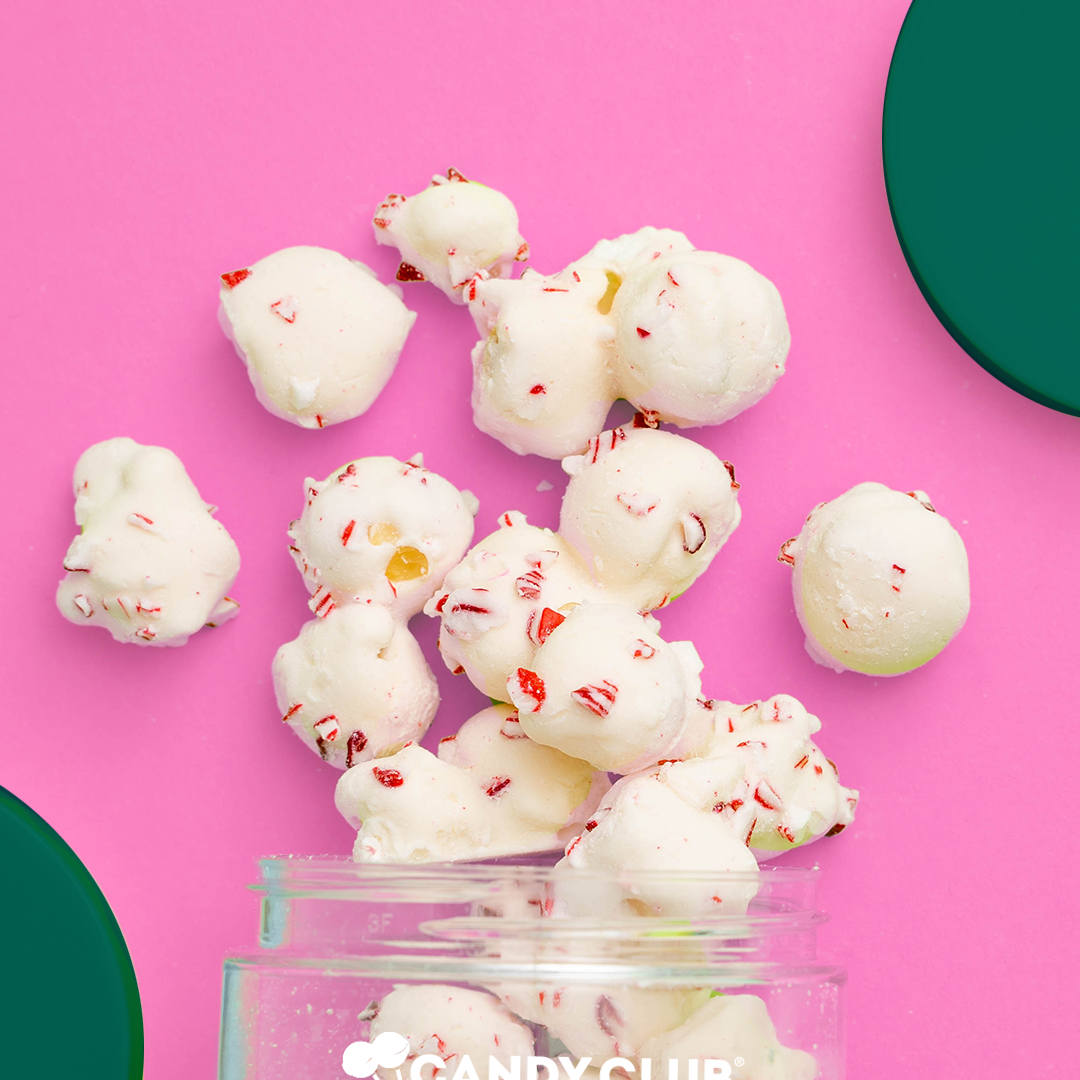 Crunchy candy canes on top of frosted kettle corn — Can the holidays get any sweeter?! This Peppermint Popcorn is fun all winter long. Candy Club makes the perfect treats for any upcoming winter event!