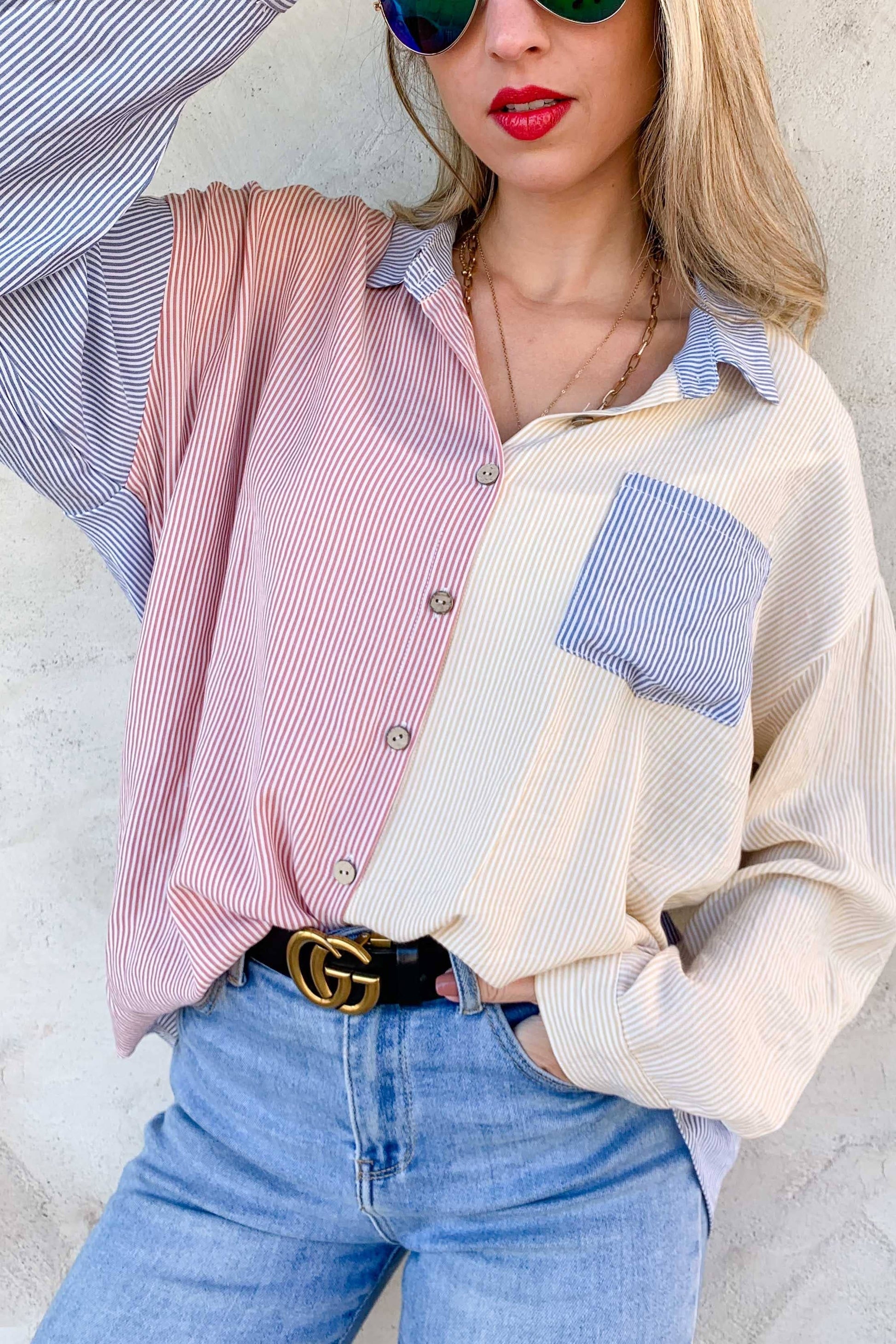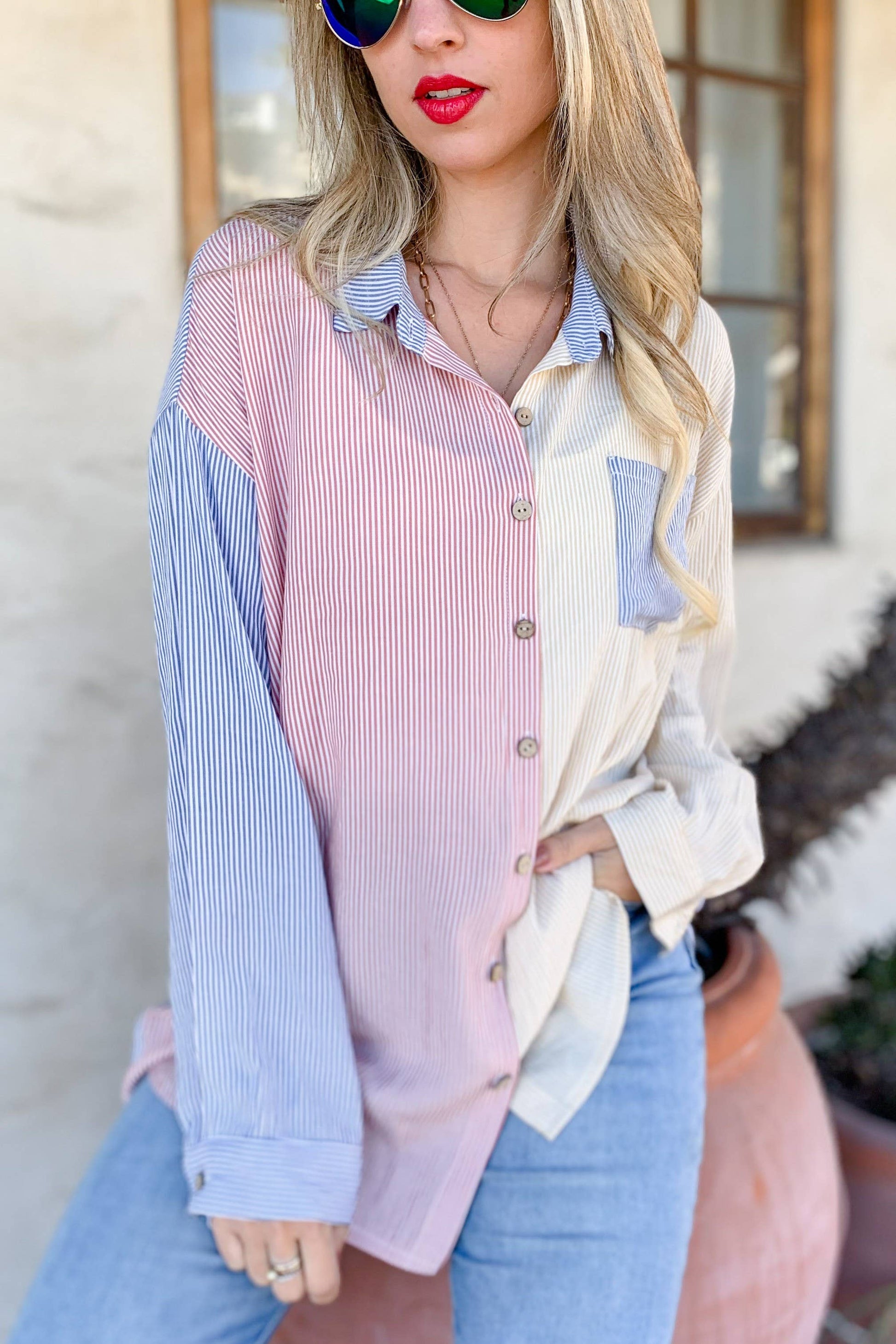Stripe Printed Color Block Wooden Button Down Long Sleeve Pocket Shirts