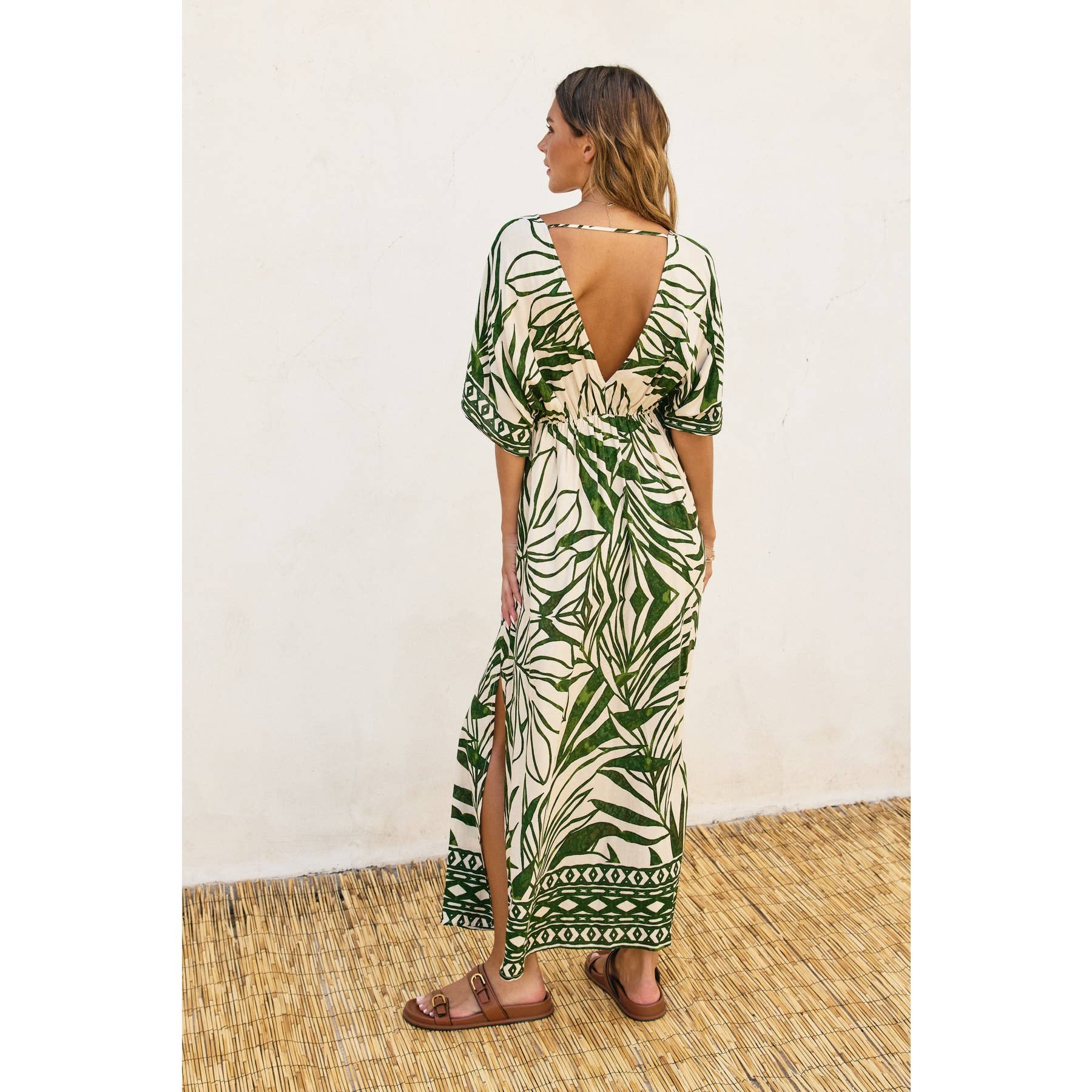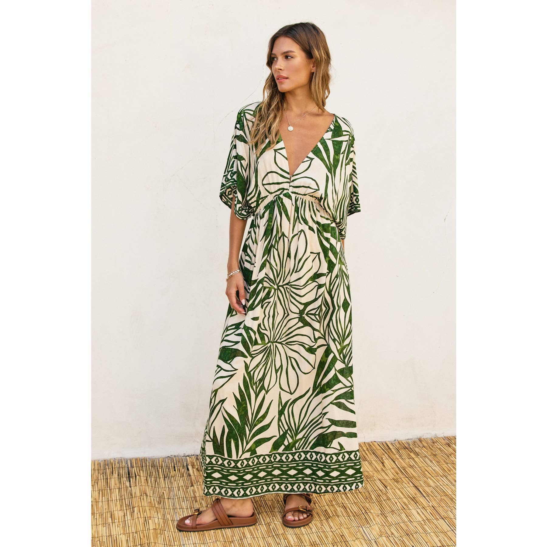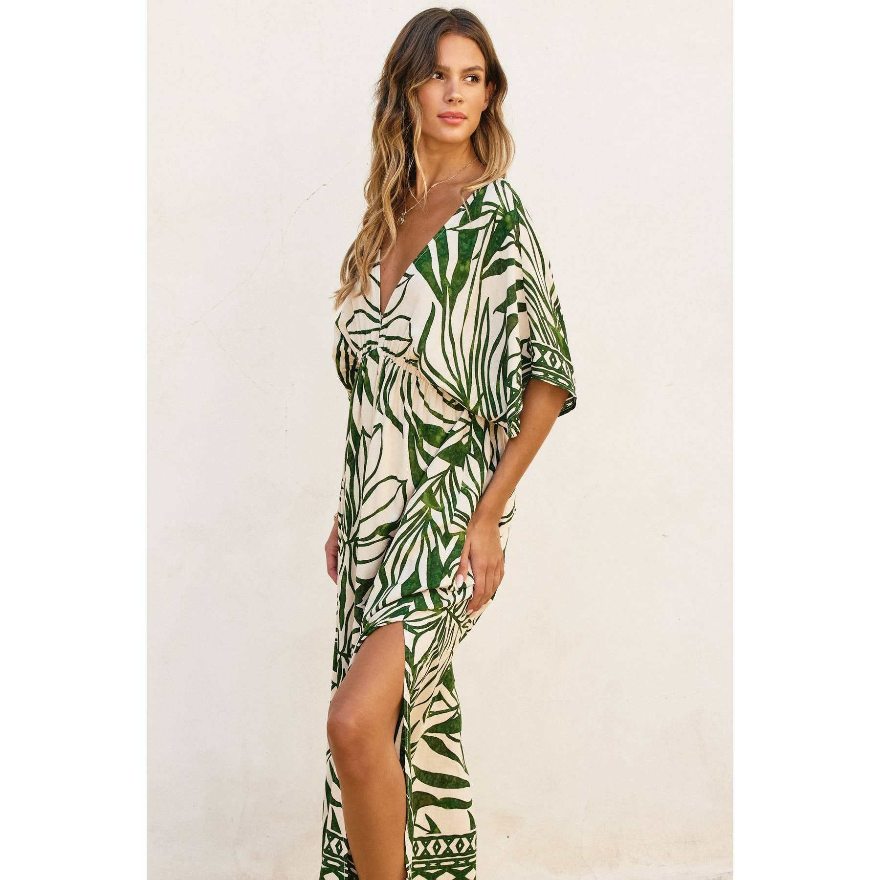 FD12482-P1932 Tropical border print maxi dress. Model is 5'8" and wearing size Small. - Plunging neckline - Front hook and eye closures - Horizontal thin strap on the back to hold the shoulders - Dolman sleeves - Elasticated waistband - Side slit - Lined Shell: 80% Rayon, 20% Linen Lining: 100% Rayon